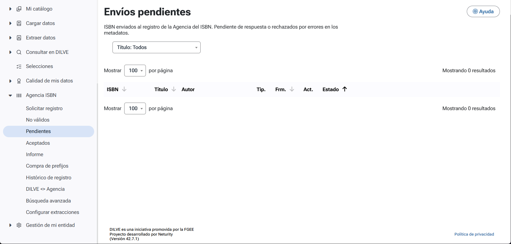 En el listado se muestran los ISBN que han sido enviados a la Agencia del ISBN y que o están pendientes de respuesta o han sido rechazados por los metadatos asignados.