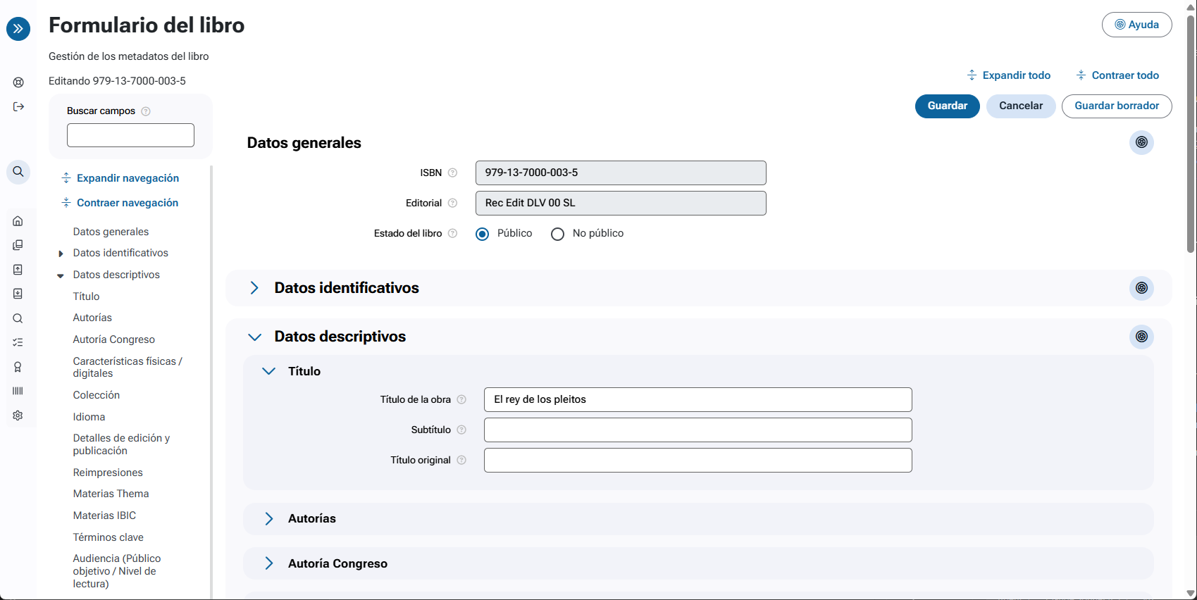 Permite dar de alta y modificar los metadatos de libros en DILVE.