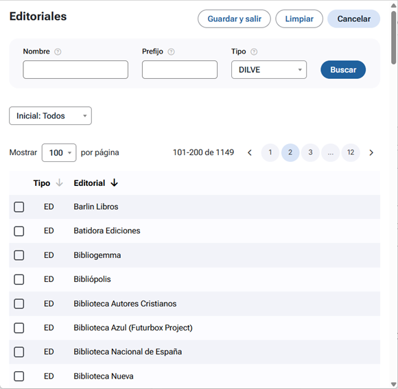En esta sección se explica cómo funciona la pantalla emergente con el listado de editoriales de DILVE, en la que se pueden ir marcando fácilmente las editoriales deseadas para añadirlas a la selección o a la lista de editoriales.