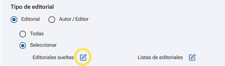 - Configuración de extracciones o de búsquedas de libros, haciendo clic en el icono que se encuentra junto al texto Editoriales sueltas en el bloque de selección de editoriales.